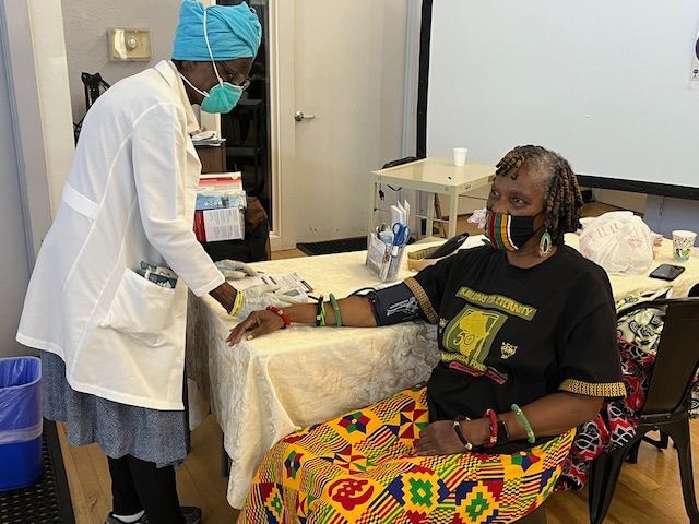 Dr Omawale Fowles. Public Health Psychologists taking blood pressures at event